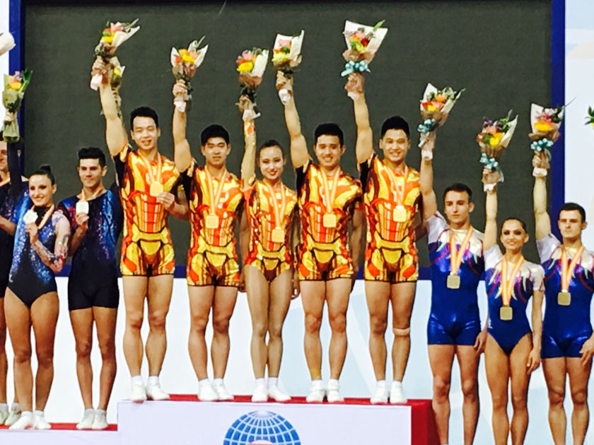 请记住这一伟大时刻,请记住这一历史性时刻,中国健美操人经历了近20年的风风雨雨,多少教练员、运动员为之付出,为之奋斗,为之期盼,终于在今天用实力、用成绩站在世界健美操团体最高领奖台,这荣誉不仅属于站在最高领奖台上运动员们,它更属于全国健美操人,是大家近20年的坚持付出,不懈的努力,才换来今天的荣誉,才带来今天的喜悦,今天是全体健美操人喜庆的节日……